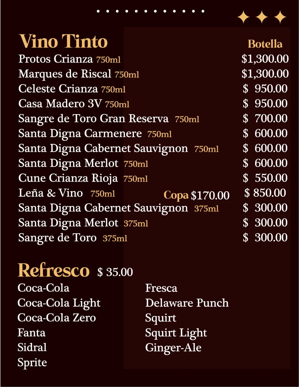 La experiencia en Leña & Vino se complementa con una selección exclusiva de bebidas que elevan cada platillo.